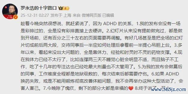 罗永浩表示,多年以来,看起来没出大问题的,全是靠体力、经验和时灵时不灵的药物支撑。现在体力已经不太行了,比如连撑两三天不睡觉心脏会明显不适,而且脑子不工作,吃了十几年的药物已经吃最大剂量也不太管用。“为我的发布会做幕后的同事,工作难度全程都是地狱级数的,每次结束后都需要疗伤。如果ADHD换药失败,或是不能用锻炼彻底改善体能问题,我不会再举办这种大型活动了,会害人害己。”