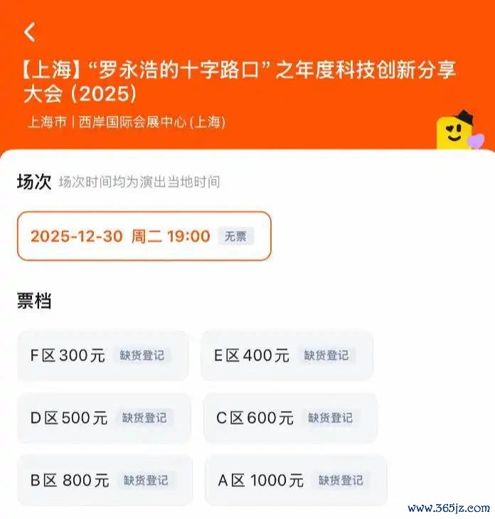 12月22日午间,“罗永浩的十字路口”年度科技创新分享大会门票正式开售。此次大会门票分为300元、400元、500元、600元、800元、1000元6档,服务说明显示:不支持退票、实名制购票和入场、不支持选座。