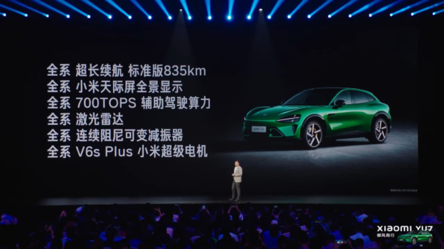 综合两次发布会的信息来看,小米YU7全系标配超长续航(标准版835km)、小米天际屏全景显示、700TOPS辅助驾驶算力、激光雷达、连续阻尼可变减振器、小米超级电机,且全系搭载800V碳化硅高压平台。