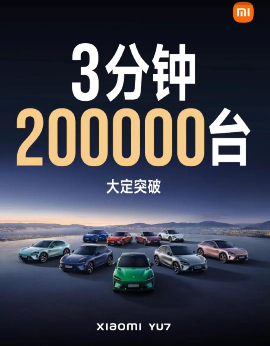 小米汽车官微随后称,3分钟,小米YU7大定突破200000台。